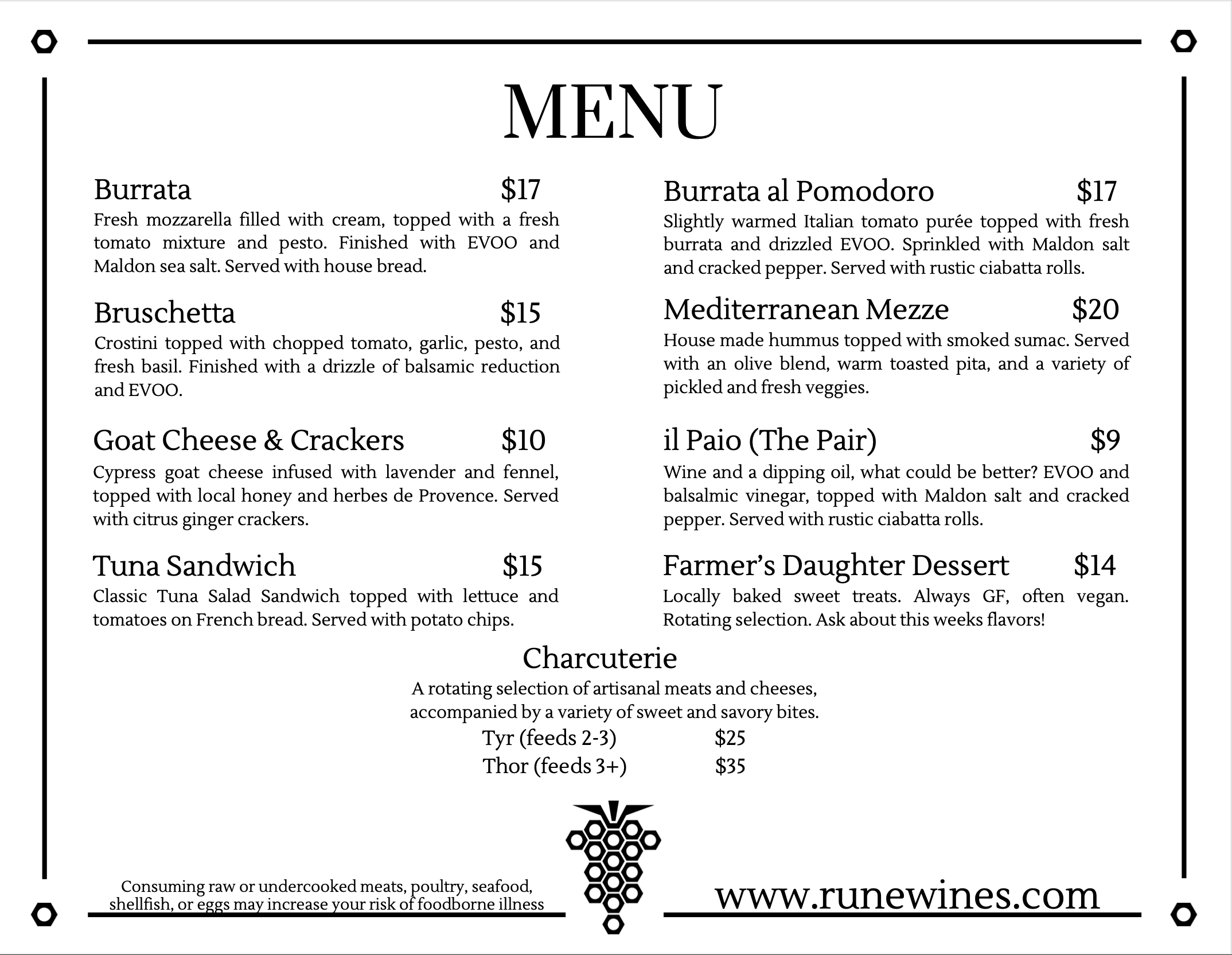 Our food menu is available 7 days a week! Enjoy a selection of fresh, seasonal small bites, boards, sandwiches, and more. A variety of non-alcoholic beverages are also available.